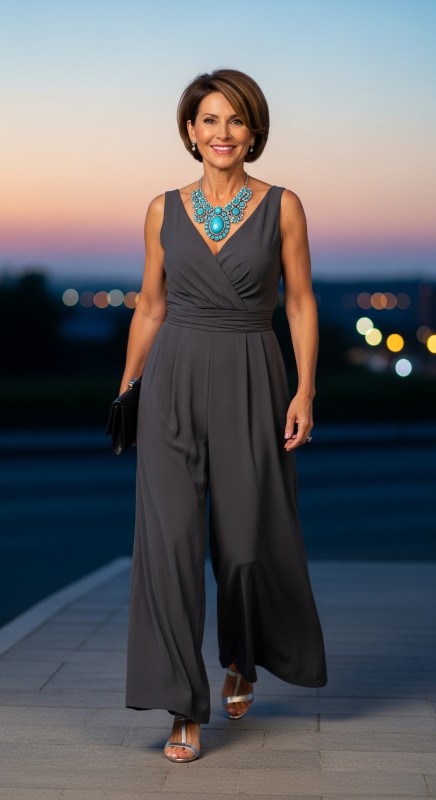 Why It Works: Jumpsuits are incredibly chic and eliminate the guesswork of outfit coordination. Charcoal is softer than black but equally sophisticated. The wide-leg silhouette is modern and flattering. A statement necklace draws attention upward and adds personality. This ensemble is perfect for cocktail parties, theater outings, or special celebrations.