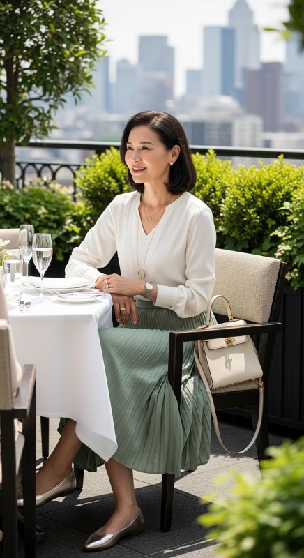 Why It Works: Sage green is a calming, sophisticated color that’s very on-trend. The pleated skirt adds movement and elegance. Silk blouse elevates the look with luxury. Metallic flats add a touch of glamour while remaining comfortable. This combination works beautifully for professional settings, luncheons, or cultural events.