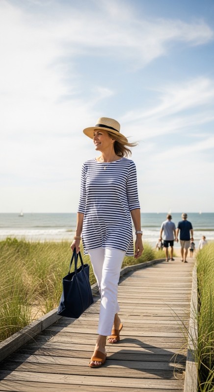 Why It Works: Stripes are timeless and nautical-inspired, perfect for summer. The tunic length provides comfortable coverage. White jeans are crisp and elegant. This casual combination is ideal for weekend errands, beach outings, or casual lunches. The straw hat adds sun protection and style.