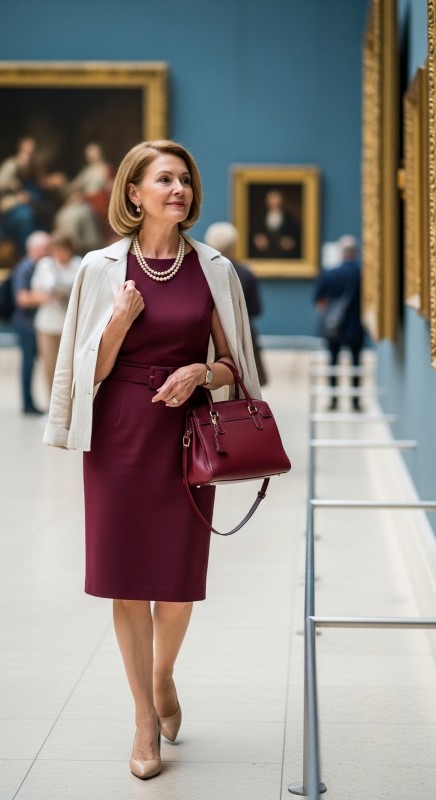 Why It Works: Burgundy is a rich, flattering color that exudes sophistication. The sheath dress is a classic silhouette that’s always appropriate. Adding a linen jacket provides coverage and versatility. This outfit works for professional settings, formal lunches, or semi-formal events. The珍珠 necklace adds timeless elegance.